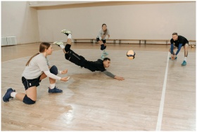 Four volleyball players engaged in a dynamic indoo