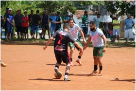 A lively amateur football game with players in action and an engaged crowd watching on a sunny day.