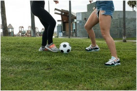 Two women playing soccer on grass in a park setting, emphasizing physical activity.