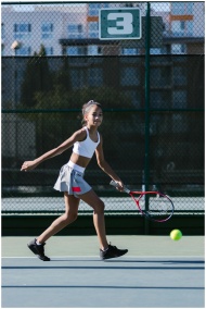 A young girl in activewear playing tennis outdoors