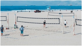 A fun beach volleyball game with players on a sunn