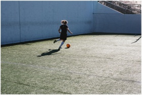 A young woman playing soccer, dribbling a ball on