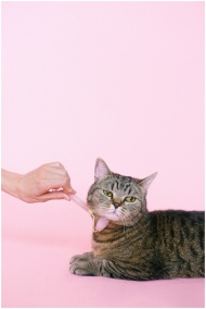 Cute tabby cat enjoys a gentle massage against a soft pink background, adding an element of pampering and relaxation.