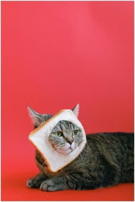 Adorable tabby cat with a bread slice collar posing against a bright red background.
