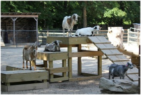 A group of goats exploring a wooden play structure