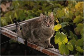 Adorable tabby cat sitting on a metal ladder surro