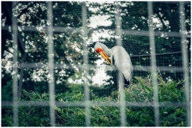 Yellow-billed stork behind a cage in Mannheim Zoo,