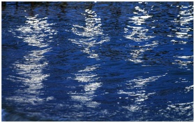 A calm lake surface reflecting soft light during dusk, creating a serene atmosphere.