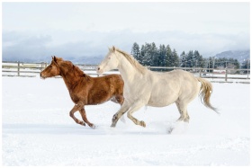 Two horses running through a snowy pasture, showca