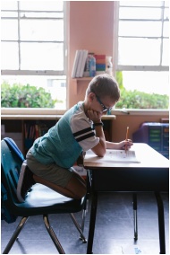 A young boy diligently doing homework at a classro