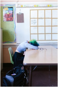 Student resting on desk in a colorful classroom, displaying tiredness and vibrant hair color.