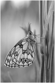 Black and white image of a butterfly on a plant stem, showcasing intricate wing patterns.