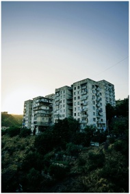Urban decay of Soviet-era apartment blocks in Tbilisi, Georgia, captured during sunset.