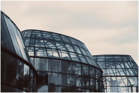 Architectural photo of futuristic glass dome buildings with metal frames on a cloudy day.