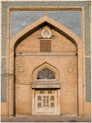 Front view of the ornate entrance to the Shrine of Bahauddin Zakariya in Multan, Pakistan.