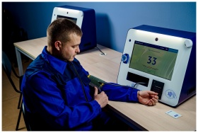A man uses a modern machine to measure his blood p