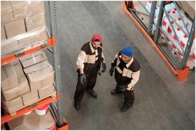 Two adult men in a warehouse communicating about storage logistics, surrounded by shelves of packages.