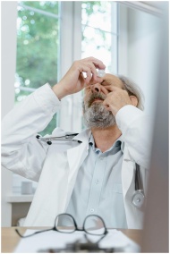 Senior male doctor in white coat applying eyedrops, sitting in a well-lit clinic.