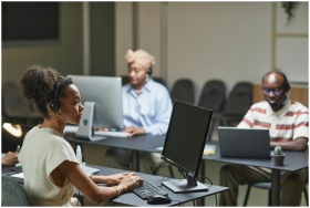 Three call center agents at work, focused and prof