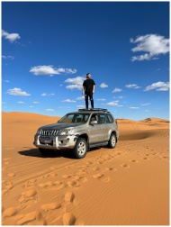 A man stands atop an SUV in the Sahara Desert unde
