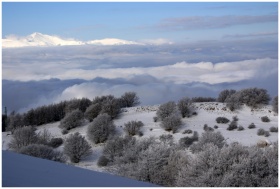 Captivating snowy mountain scene with clouds and trees at dawn, perfect for winter landscapes.