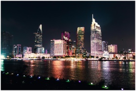 Vibrant and colorful night view of Ho Chi Minh City's iconic skyline reflecting on the river.