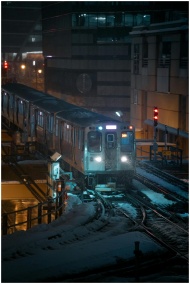 A train traveling in the snowy streets of Chicago at night, showcasing urban transport.