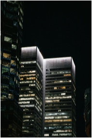 A nighttime cityscape of Montreal showcasing brightly lit modern skyscrapers.
