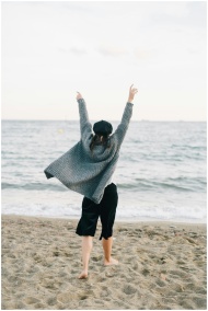 Back view of a woman with raised arms enjoying peace by the ocean shore. Embracing freedom and tranquility.