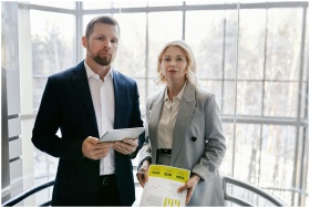 Two business professionals in a modern office disc