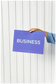 A hand holds a blue placard with 'Business' signag