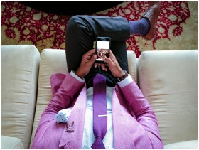 A man in a stylish pink suit sits on a sofa using