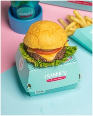 Close-up of a juicy cheeseburger with fries on a pastel background, perfect for food photography.