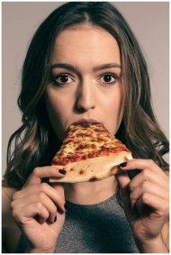 Young woman enjoys assorted fast food and snacks i