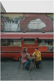 A couple dining near a bright red food truck on a cool day, sharing a meal.