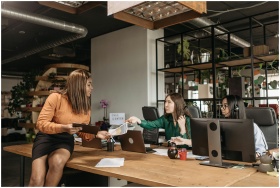 Diverse group of female professionals discussing work at their desk in a modern office setting.