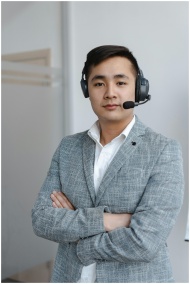 Asian male call center operator wearing a gray suit with a headset, providing customer service support.
