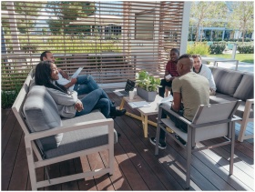 Diverse team having a collaborative meeting outdoors in a modern office setting.