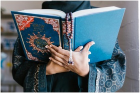 A Muslim woman in traditional attire reading the Q