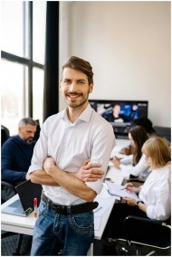Smiling man standing confidently in a modern offic