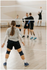 Group of athletes playing volleyball indoors, show
