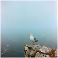 A lone seagull perched on a foggy cliff with the ocean in the background, representing solitude and freedom.