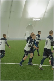 Young soccer team practicing indoors on artificial field, showcasing teamwork and athleticism.
