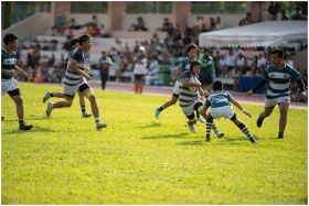 Boys playing a competitive rugby match outdoors on a sunny day.