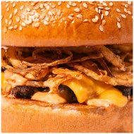 Mouthwatering close-up of a cheeseburger with cris