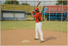 An African American man in a baseball uniform pois