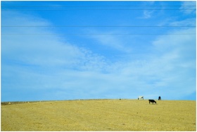 Idyllic rural scene of cows grazing on a dry pasture under a bright blue sky.