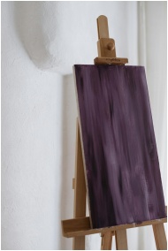 A vertical abstract painting with deep purple hues on a wooden easel indoors.