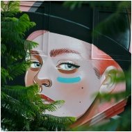 Striking street art mural of a woman's face surrounded by greenery in Adelaide, Australia.