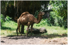 A dromedary camel stands in a lush, sunny landscape in Bali, Indonesia.